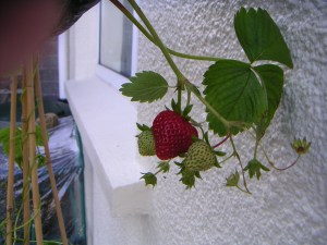 My homemade upside down tomato planters are faring well and the plants are covered in flowers and I hope for some toms in the near future. The rest of the garden is a bit hit and miss. My Bramley apple and Victoria plum trees have doubled their yield since last year and there are two fruits on both of them!!! However, the strawberries in the hanging basket are thriving and I keep picking strawberries; it’s lovely to leave them there until they are completely ripe and eat them straight off the plant!