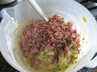 I minced some 'cooking bacon' and two shallots in the food processor and then fried it. I then mixed it with the mashed potato. To make it bind, I added a beaten egg and a heaped tablespoon of cornflour.