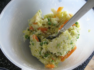 Yesterday for supper, we had boiled gammon, mashed potatoes and veggies. I purposefully cooked enough for another day. The rest of the gammon is safely wrapped and in the fridge so I used up the rest of the mashed potatoes and veg. I mixed mashed potato, cabbage, peas and carrots all together.