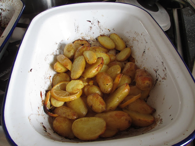 In a roasting tin, toss the potatoes with the lemons, oil and some seasoning - I added more oil.