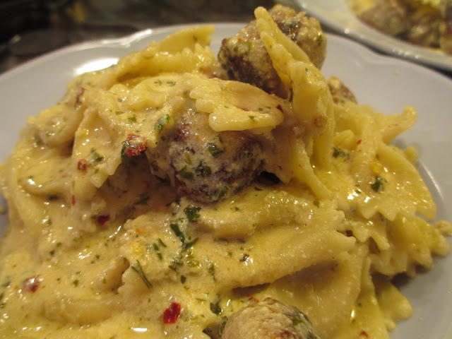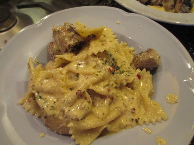 7. Add the sausages and sauce, stir the parsley through the sauce and pasta.