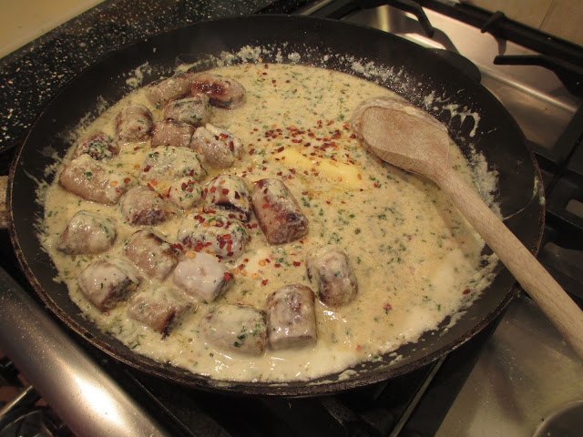 4.Add the stock to the sausage meat and let bubble - stir for 2-3 minutes until liquid has reduced right down.
