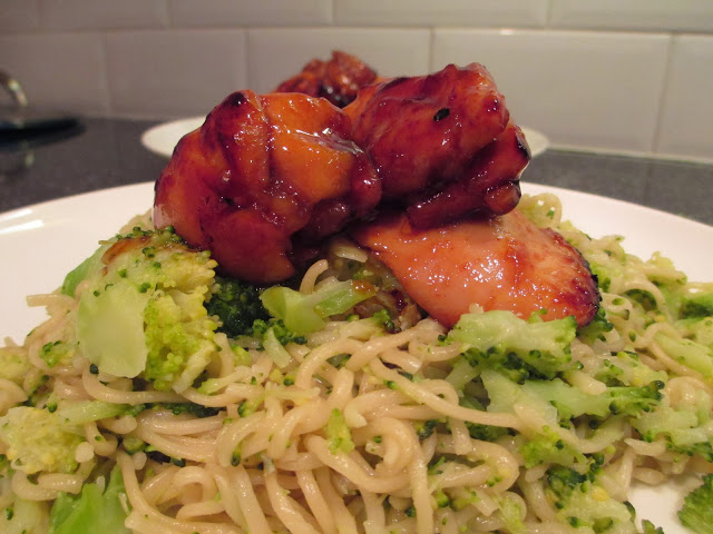 I cooked a small head of broccoli and some value brand noodles (12p Aldi) and served that with the sticky chicken.