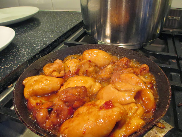 I transferred them to a small frying pan and cooked them for another five minutes on a high heat. This gave the sauce a sticky jam like quality. Cook them until they start to brown but catch them before they burn as there is sugar in the sweet chilli sauce which will weld itself to a frying pan.