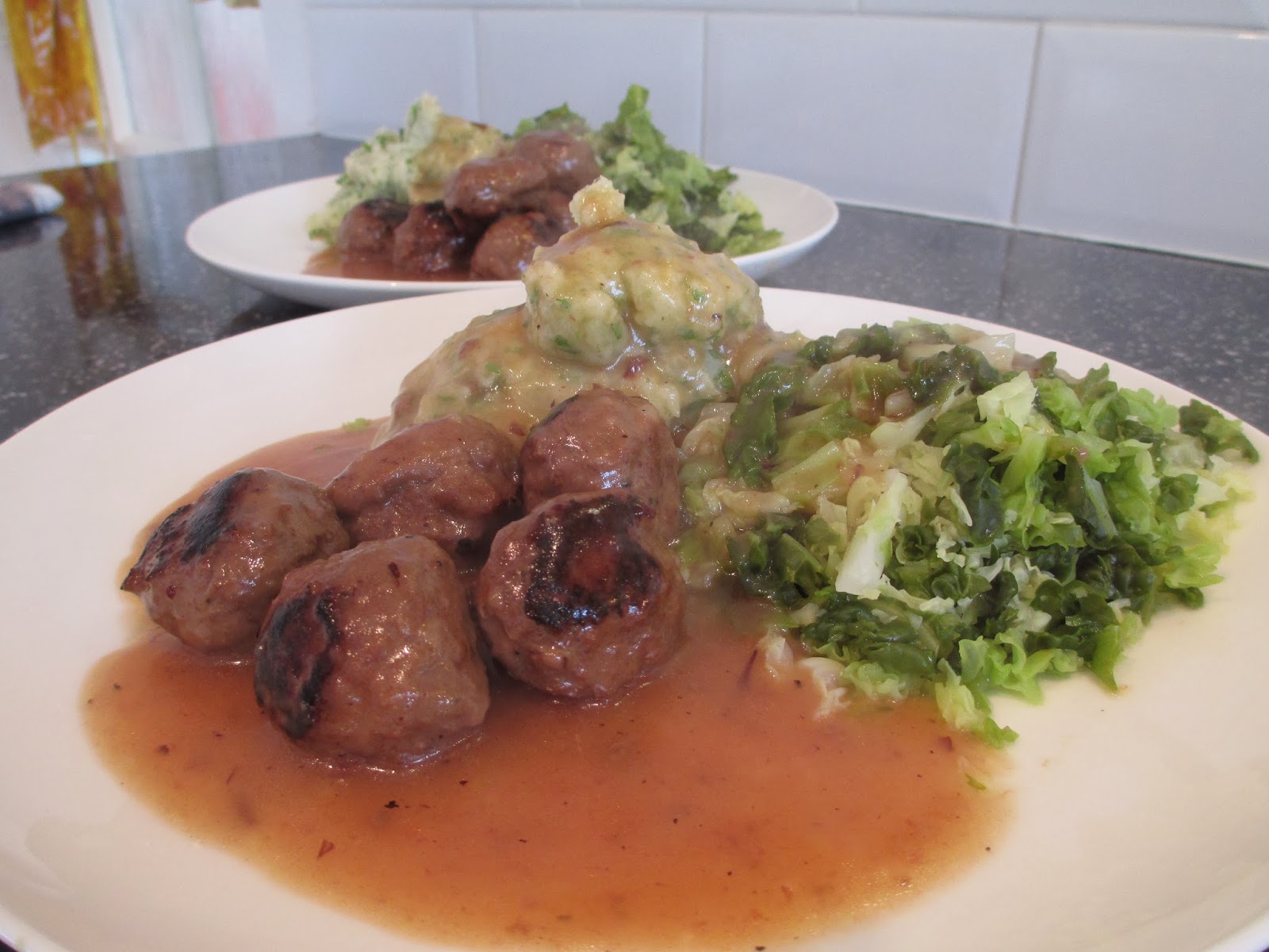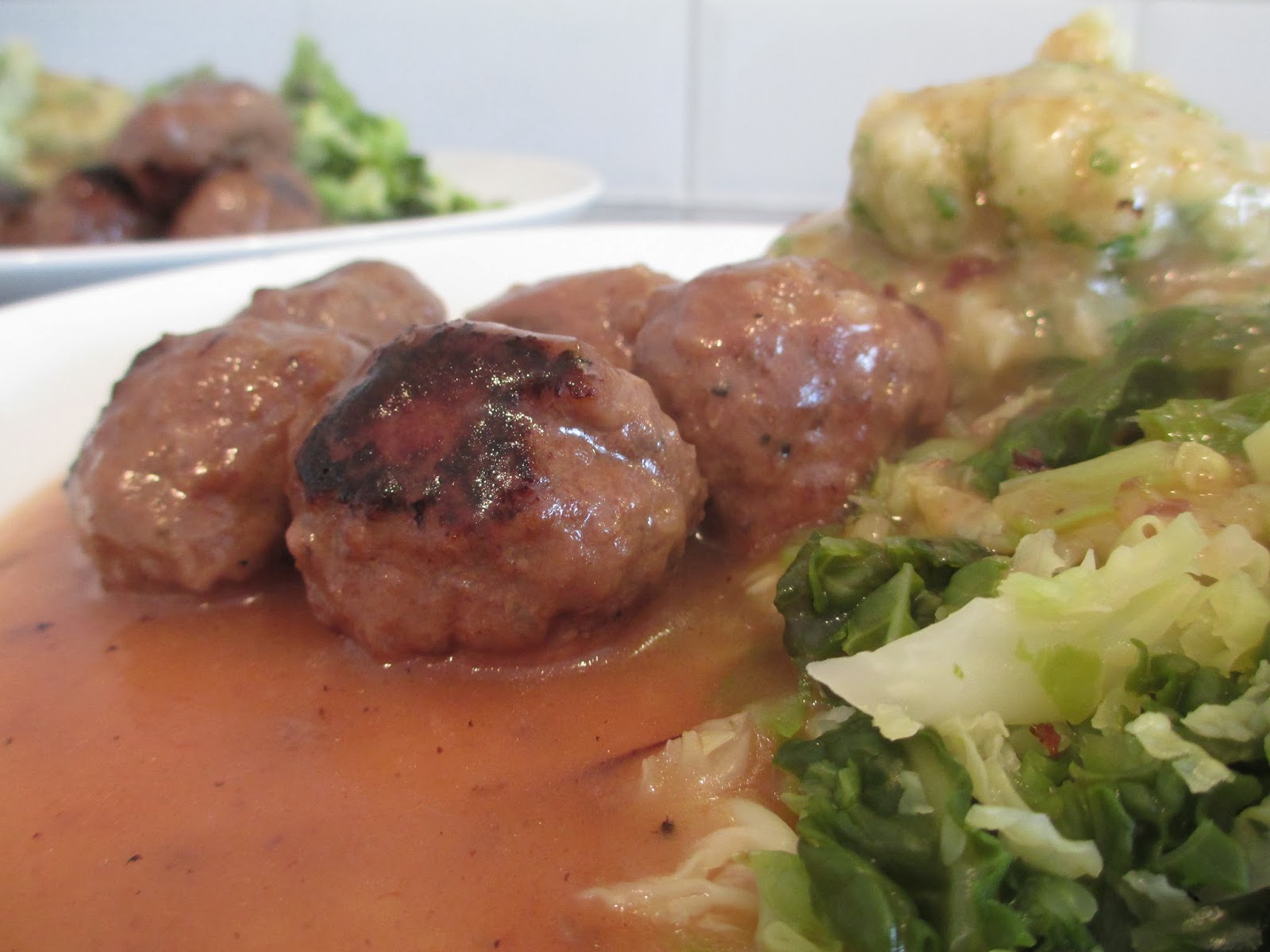 As for cabbage : I get some bacon, or if I'm feeling generous, ham and dice it up and put it on a gentle heat. At the same time, I boil some water and place moderately finely chopped cabbage to the water. I boil it for 2 minutes. Drain it well. By this time, the bacon or ham is nicely coming along, so I then add the cabbage, drop a lid on the fry pan and turn the heat down. I'll give it a stir a few time. Do the taste test. The cabbage should be wilted a bit and the bacon a little crispy. The cabbage will take on a lot of bacon flavour and it is really yummy. You could side serve that with the meatballs if there was going to be a crowd around the table.