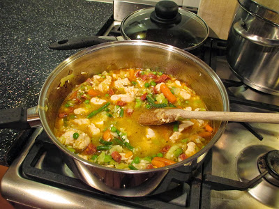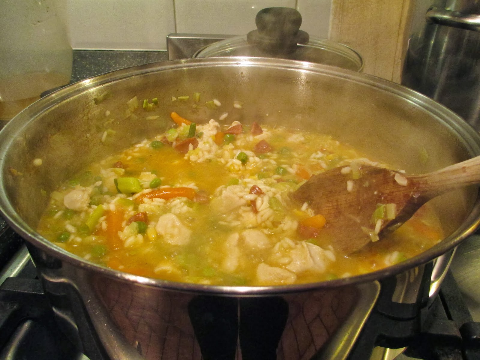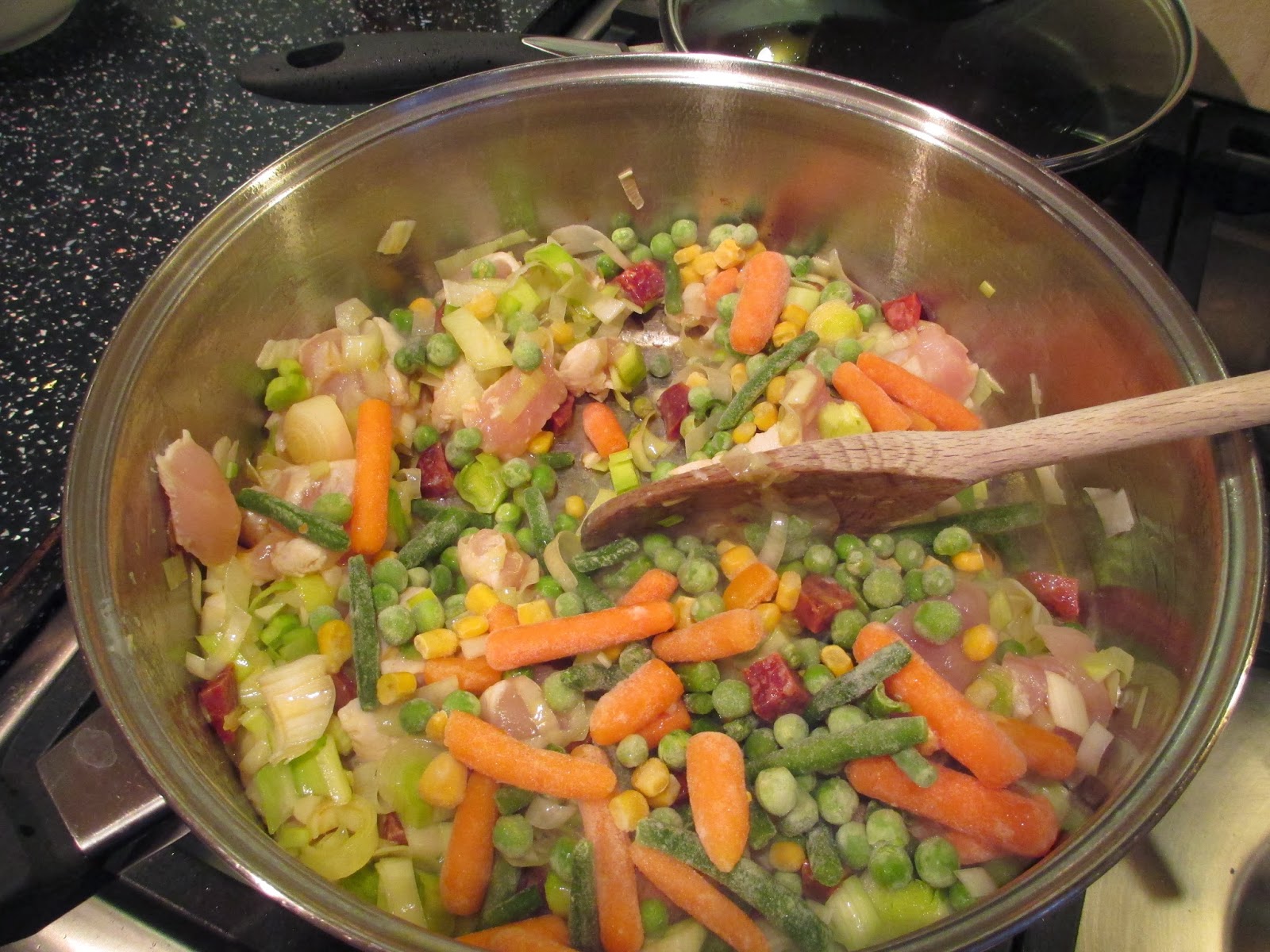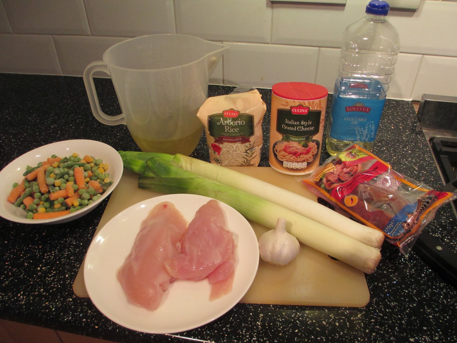 We've had rain, wind and storms and every time I open the front door bits of garden and shrubbery get swept into the house! It's just the weather for a chicken pie! In the absence of pastry, although I will get round to gluten free pastry, I decided that the contents of the pie could go into a risotto.