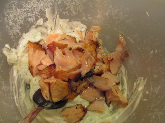 2.Mix together the salmon, creme fraiche, dill and mayonnaise - I also added a squirt of lemon juice.