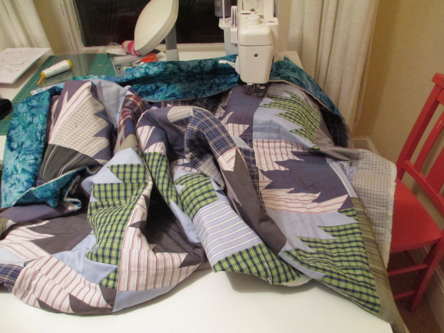 And finally, I’ve been quilting away in between it all. My scrappy mountain majesties quilt, all made from old shirts in coming along quite nicely.
