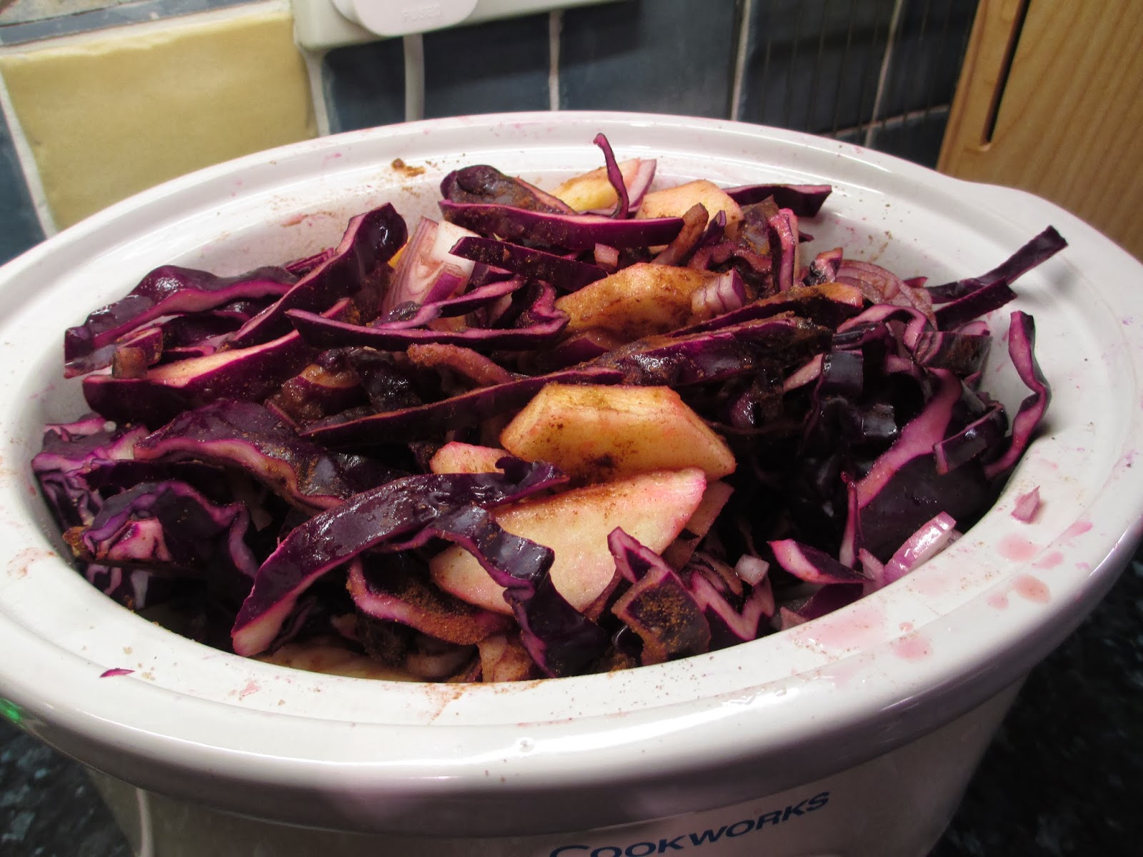 Before I left for work, I shredded a red cabbage, peeled and sliced two Bramley Apples, peeled and sliced two red onions, added some vinegar, mixed spice and sugar and left for work.