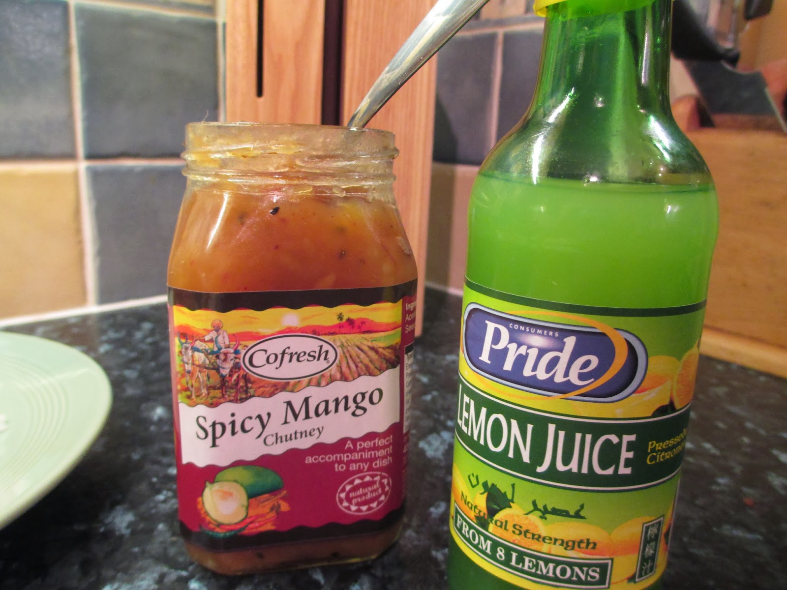 Sprinkle with lemon juice and a hearty dollop of mango chutney. A pint of beer would have been nice but it's no where near pay day. The store cupboard is a blessing when I need enthusiasm and ready ingredients.