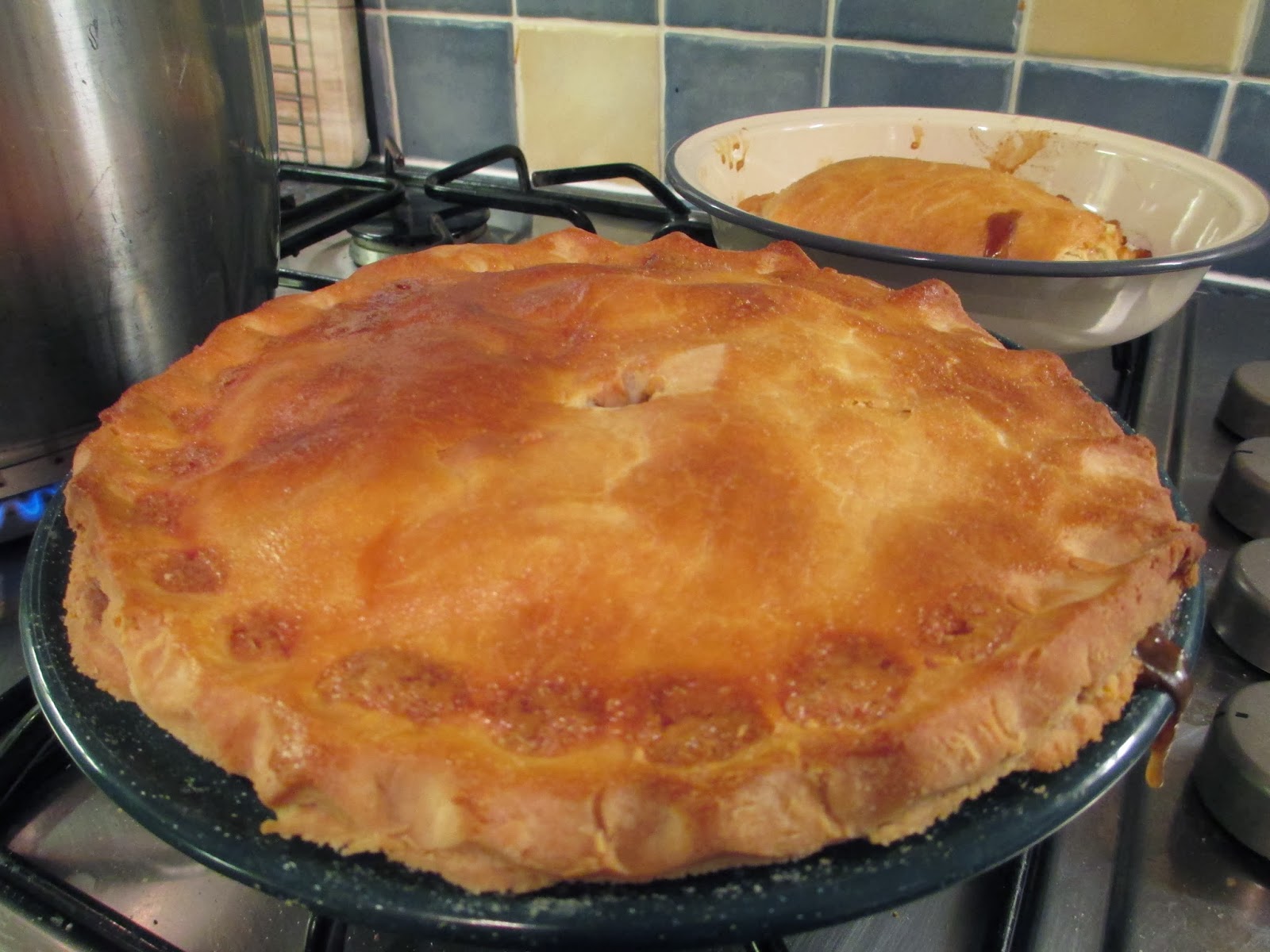 Yum! Your pie looks delicious. Here in he USA pie means dessert. Usually filled with fruit or custard. The only pie I ever make throughout the year is pumpkin, and only because it's a favorite of my famiy. My mother used to make'pocket pies for my dad. They were made of biscuit dough (American biscuit-not cookie dough). She rolled a small dough ball out into a circle, filled with a spoonful or two of sweetened fruit or jam, then folded over, crimped edges, then cooked in a buttered cast iron skillet until each side golden brown. I've never made these because the calories are high, but they are good, especially with peaches and cinnamon inside.