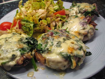You don't need portions as large as ours. The mushrooms came in packs of four, we felt two each were too few and to be honest, four each were too many! The mushrooms, onions, garlic and spinach have very few calories but the indulgent butter and cheese made this calorific and delicious. It's also high in vitamins A and C, calcium and iron, has 25% of the daily required protein and is low in carbs. All that has to be worth the calories and cost!!!