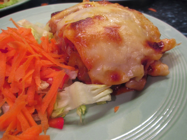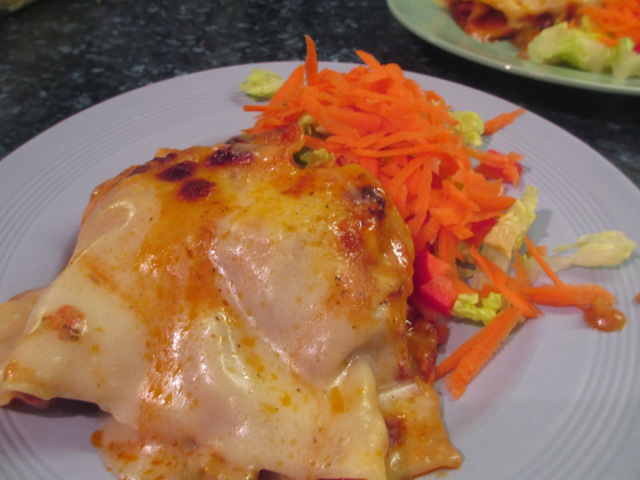• Finish with a liberal pouring of the cheese sauce. You could sprinkle some cheese on top. We ate ours with lettuce, grated cheese and some chopped red pepper.