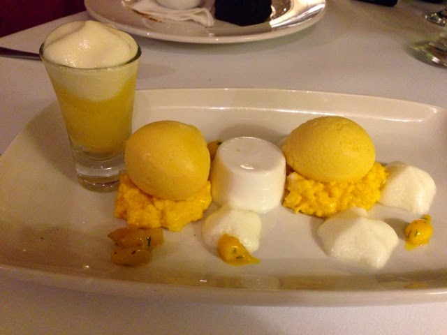 Dessert? Mango ice cream, coconut panna cotta and pina colada sorbet……brilliantly gluten free too.