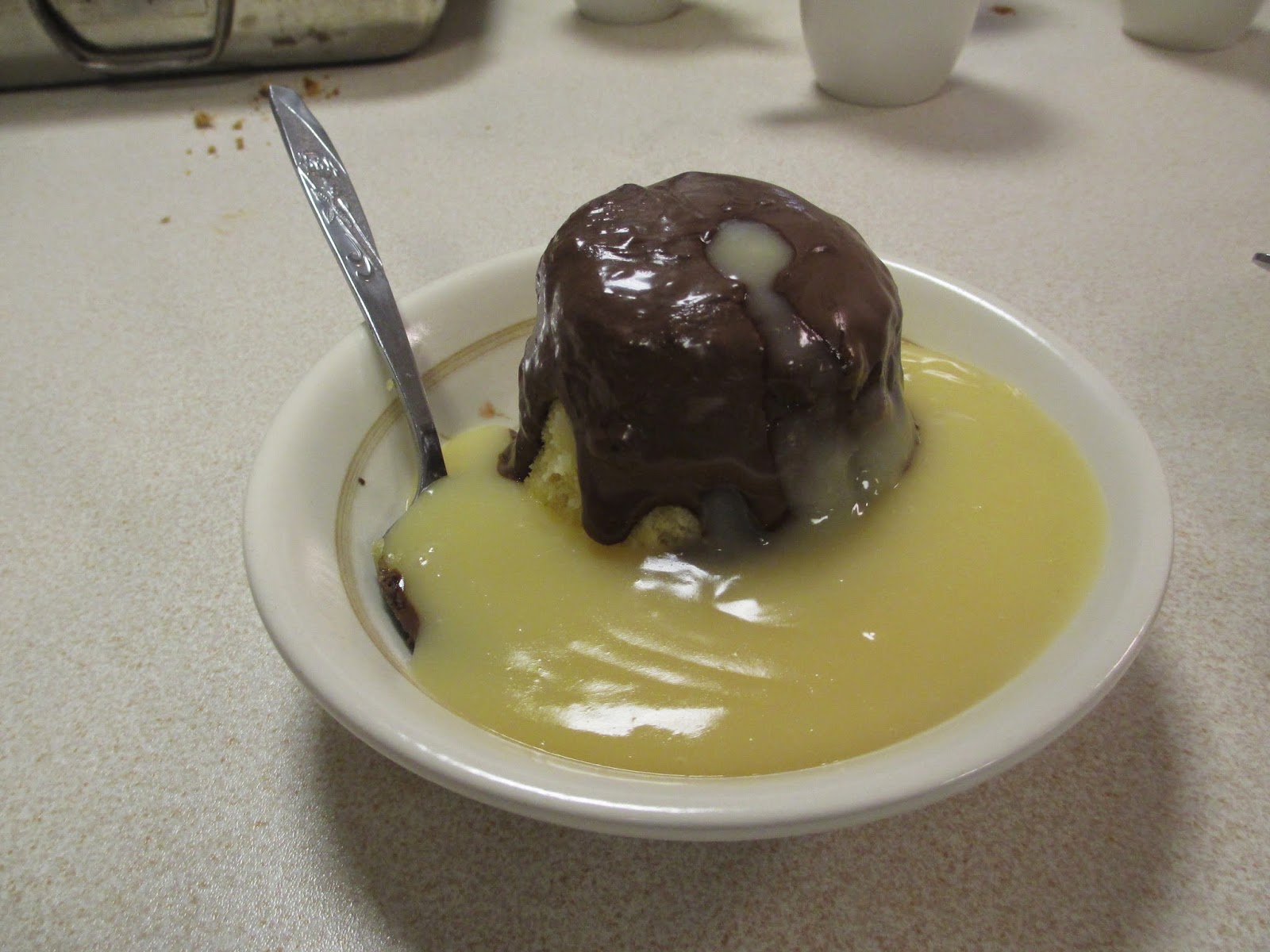 Choccie sponge puddings cooked in mugs in the microwave.