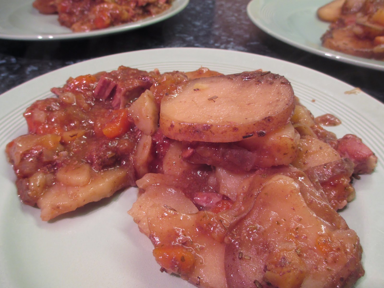 Switch on low and go to work. I like the way the potatoes and vegetables soak up the flavour of the meat, I like that homely stewiness. I like the way the meat just falls off the bone and that I could have eaten my supper with a spoon had I chosen. I like the way a crock pot makes very humble food tasty.