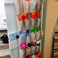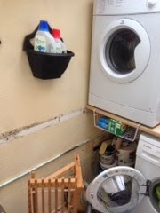 My cottage, once had a tiny back yard with an outside loo. It now has a covered yard, where I keep the washing machine and tumble drier and the downstairs loo. I don’t use it much so I have shelves with tools, the mop, ironing board and clothes racks for drying. I did some research on Pintrest on small space storage and found a door shoe rack used for storing cleaning products. I bought this in Argos for £4.99 and it does the job really well.