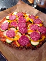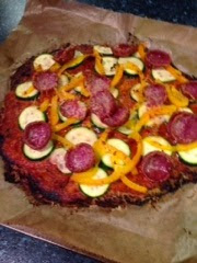 Finally, I topped it with courgettes, a yellow pepper, some salami slices and a sprinkle of hard cheese.
