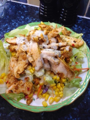 My slimming world meals are going well, it's quite an odd concept that there are foods that I can eat as much as I like of. I mixed tikka curry powder with cheapie fat free natural yoghurt and coated chopped chicken and baked it for twenty minutes. A 49p bag of Aldi salad and half a tin of 33p Aldi sweetcorn. The salad dressing is yoghurt, mint and a drop of water to thin it down. All really cheap!