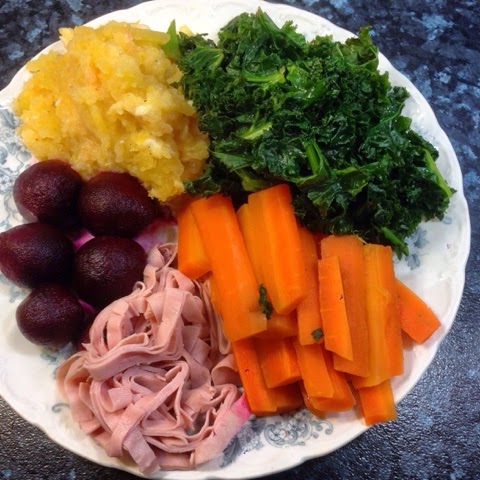 So, my breakfast was a slice of gluten free bread with a poached egg, lunch was chicken tikka and rice and supper was a simpler affair of steamed kale, carrots and swede that I mashed with a couple of cheese triangles, 50g of ham and some beetroot.