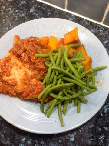 Supper last night was spicy pork with roasted butternut squash and steamed green beans. To make this I used: