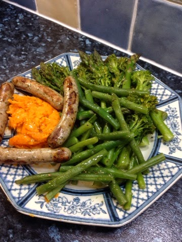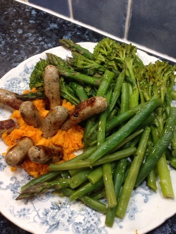 I really am of the belief that you can’t spend every day worrying about money and every now and then that we need a treat. I splurged on green beans, tenderstem broccoli and some amazing asparagus. The bright orange is a skinned baked sweet potato with four low fat sausages. Not cheap in anyway at all but it’s Friday night, we struggled through Cornwall bound traffic and got home late.
