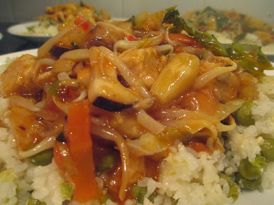 Here’s my ingredients for our meal for four (lovely guests for supper tonight) of sweet and sour chickenless and egg fried rice.