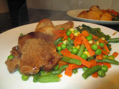I wanted to show you how it over flows so you can see that it needs to stand on a baking tray or your oven will be full of gravy. I served ours with mixed veg (half a bag 99p from Aldi).