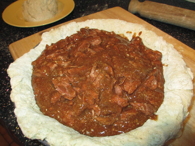 I made the pie filling by chopping half a kilo of beef shin (meat off the bottom of the leg) with a diced onion, some salt and pepper and then covered it in water and cooked it for twelve hours in the slow cooker. I switched it on before I left for work and added gravy granules when I got home to thicken the sauce.