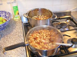 The chopping and peeling does take a while, but listen to the Archers of afternoon play and the time passes so easily. Don’t worry if you don’t have a large preserving pan. Whilst I was chopping and filling up the largest pan I have, I realised it would not fit. I washed out with washing up bowl with boiling water and mixed all of the ingredients before transferring it to two pans.