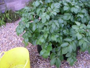 Spuds and blooming with lovely purple flowers and looking promisingly productive………we may get spuds soon!
