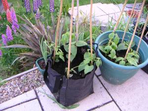The beans in a bag are shinning up their poles and the onions are filling their pots.