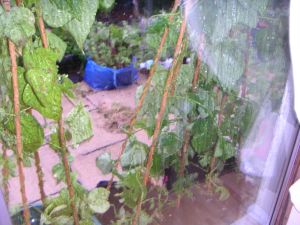 It’s a terrible photo, but my beans have had a bashing, so I’ve moved them close to the house, and I’ve re-tied up all the tomatoes and closed the little green house. It’s a terrible night and I’m glad to be off to be tucked in with a hot husband and a good book!